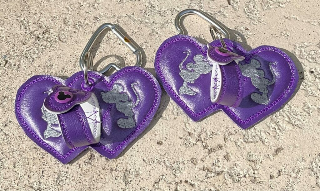 For the 100th anniversary, Disney has been showing lots of purple and silver designs. These ear holders definitely pay tribute to that color scheme! To add to the look, the classic image of Mickey and Minnie kissing in beautiful, stitched silver is the star of the show.