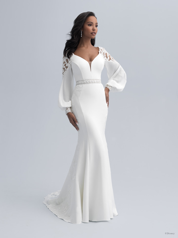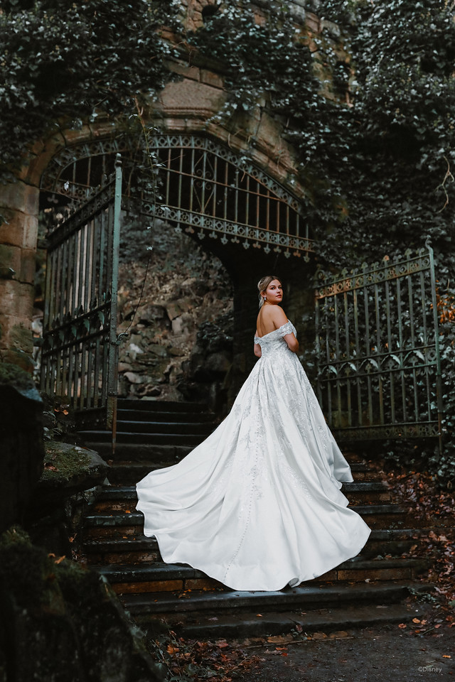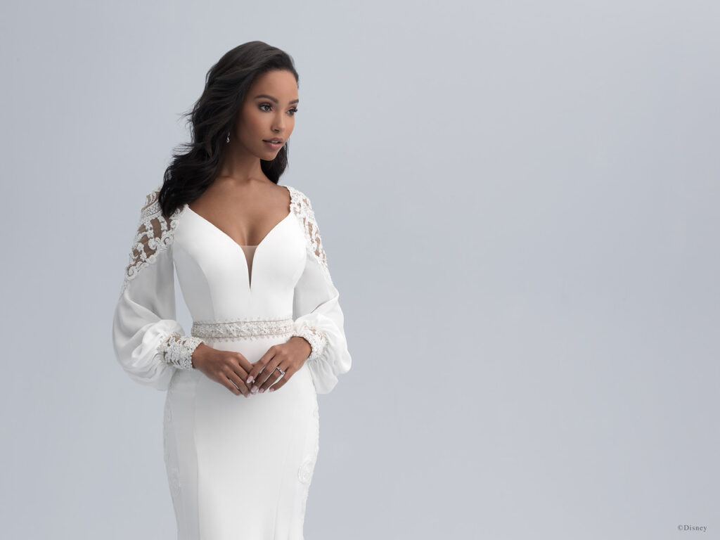 The gowns created in celebration of these anniversaries were inspired by Jasmine and Snow White’s individual personalities and senses of style. The Jasmine Platinum gown sparkles with almost 14,000 beads and crystals — mesmerizing elegance softened by the floating silhouette of bishop sleeves. The design team modernized Jasmine’s look by incorporating a beaded appliqué to the shoulder and a cuff for the adventurous, modern bride.