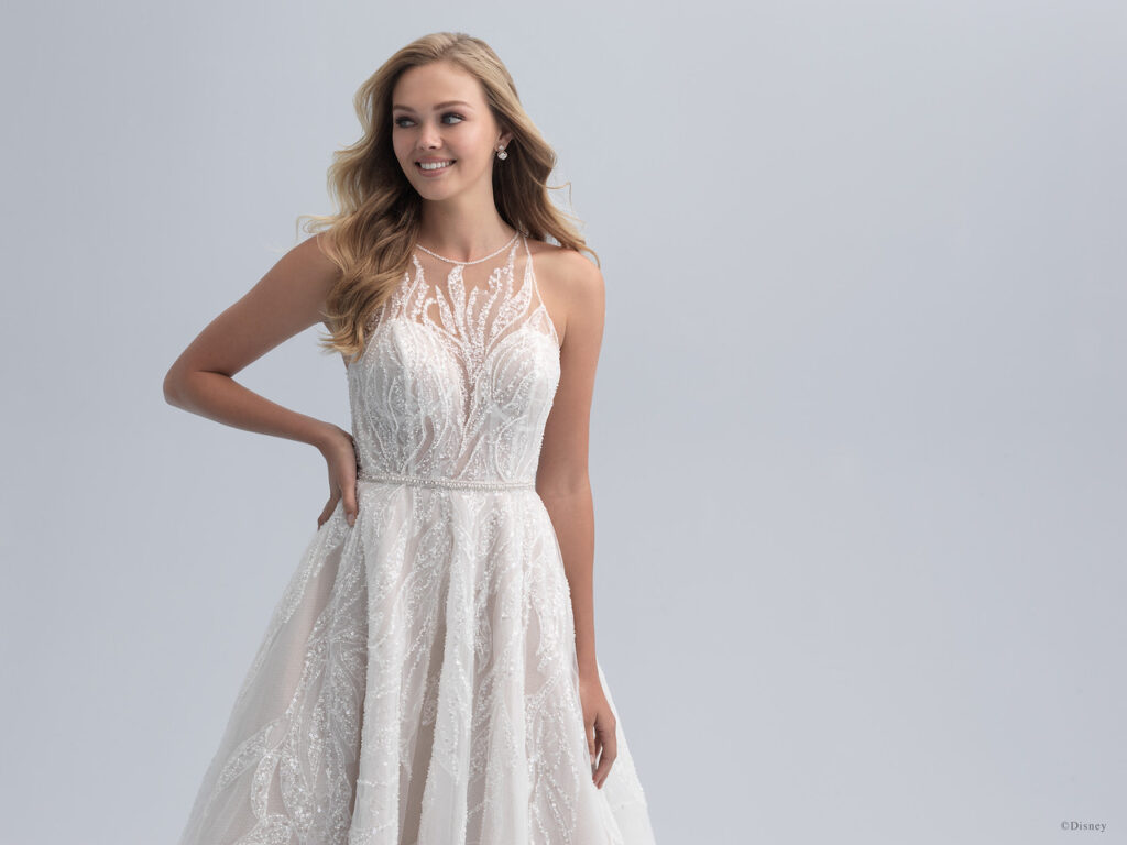 The Ariel-inspired Platinum A-line gown features a delicate halter neckline and beaded illusion keyhole back, while the skirt is adorned with glittering beaded fronds, gently swaying like the ocean’s tide. Pearl buttons and a beaded belt finish the look.