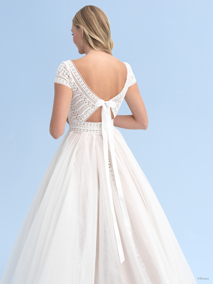 Inspired by Rapunzel’s free-spirited nature, this ballgown features a crocheted cotton lace bodice with soft cap sleeves, along with a full skirt in swiss dot sparkle tulle — beautiful, comfortable and perfect for your wedding adventure.