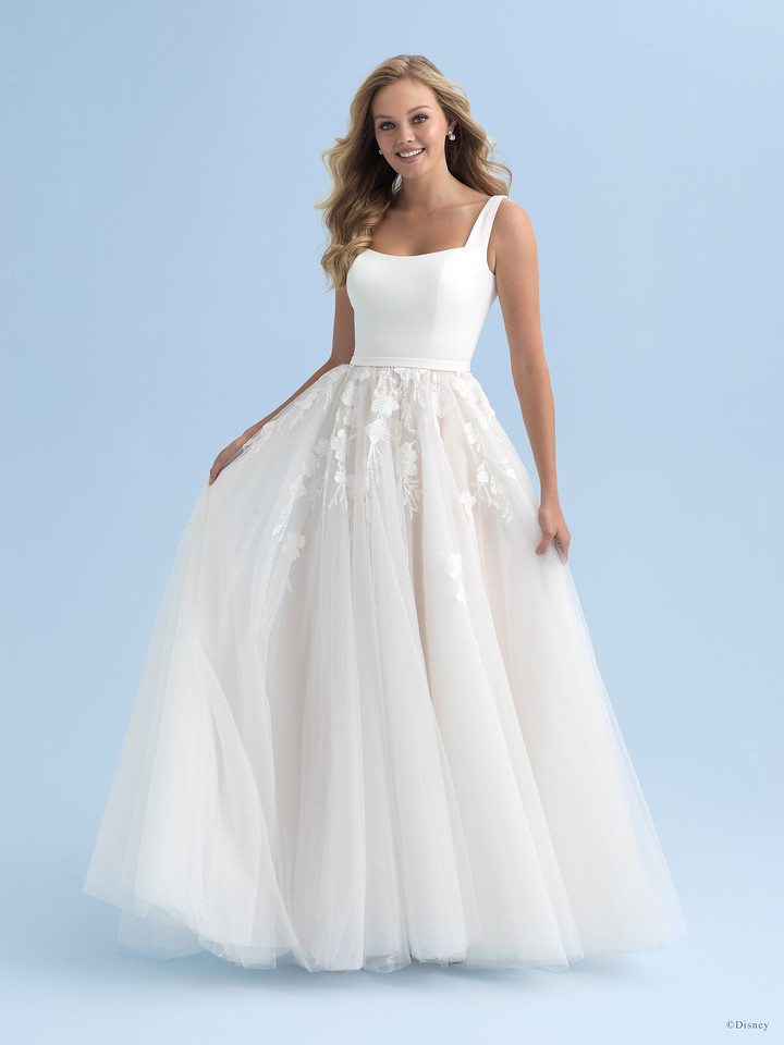 With its graceful A-line silhouette, fitted bodice and subtle scooped square neckline, the Aurora-inspired Platinum gown features mesmerizing beaded floral appliqués across a layer of shimmering Swiss dot tulle. A truly regal gown.