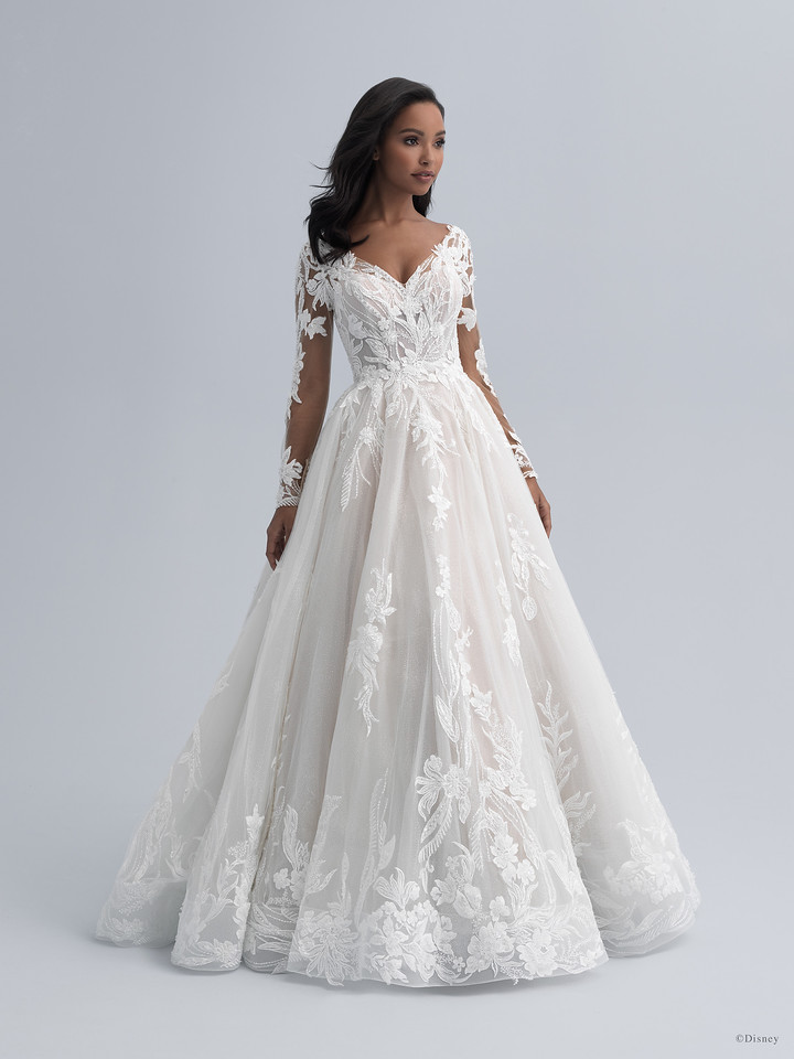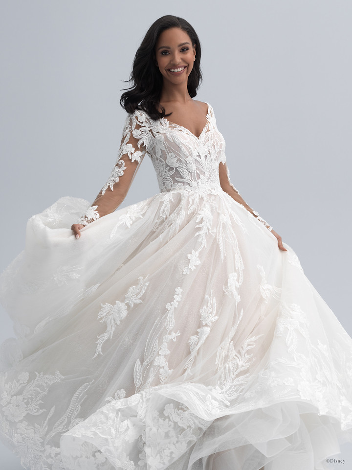 Paying tribute to the 30th anniversary of Disney’s “Aladdin,” this gown reflects Jasmine’s confidence — with a long sleeved bodice featuring tonal beading, dimensional blooms, and dramatic embroidery, beautifully balanced with an enchanting soft A-line tulle skirt.