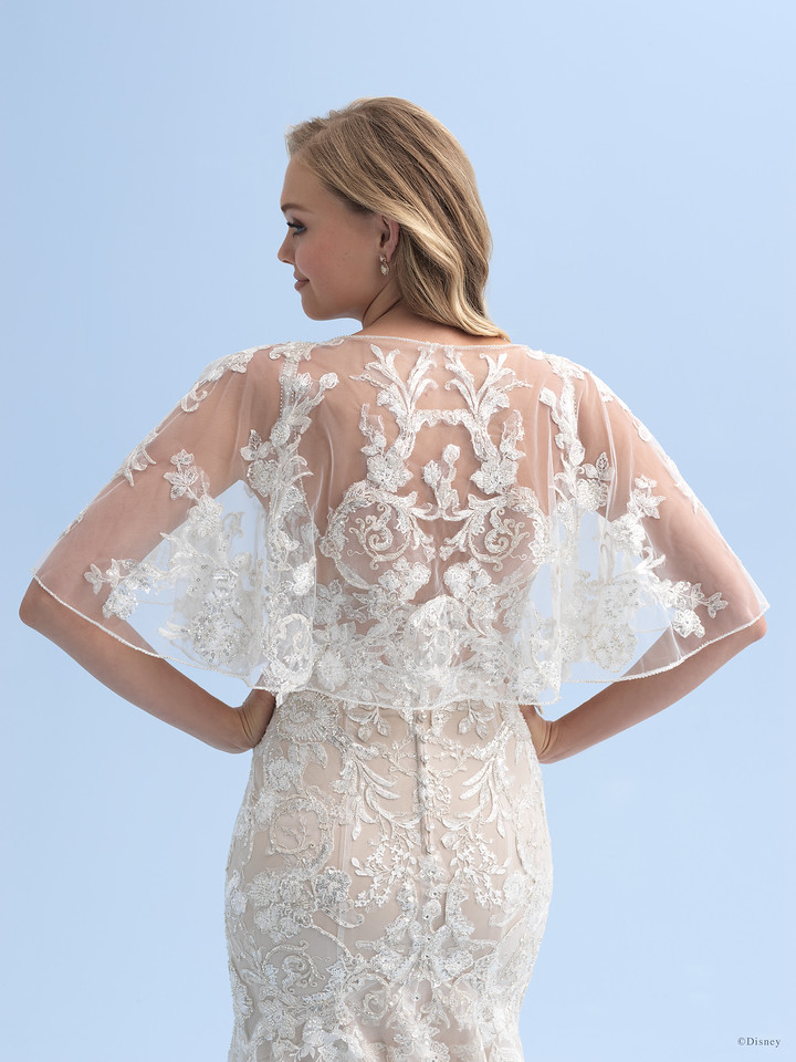 Delicately finished with a sheer capelet, this Aurora-inspired gown is covered in embroidered blooms inspired by briar roses and adorned with intricate beadwork, sequins and metallic threading. Symmetrical appliques adorn this sheer illusion capelet, inspired by Disney’s Sleeping Beauty.