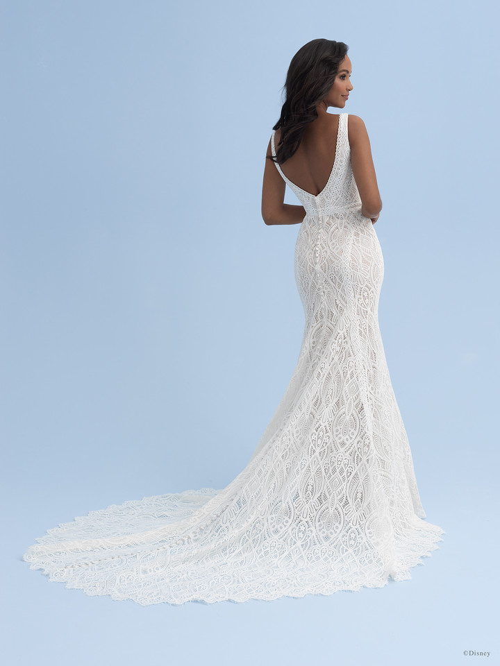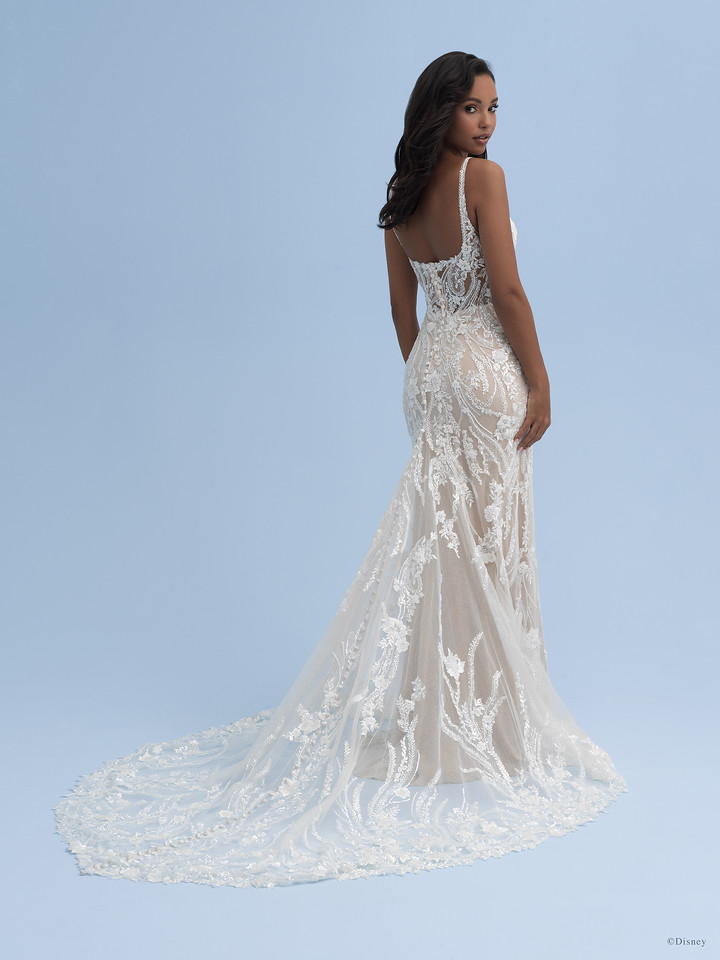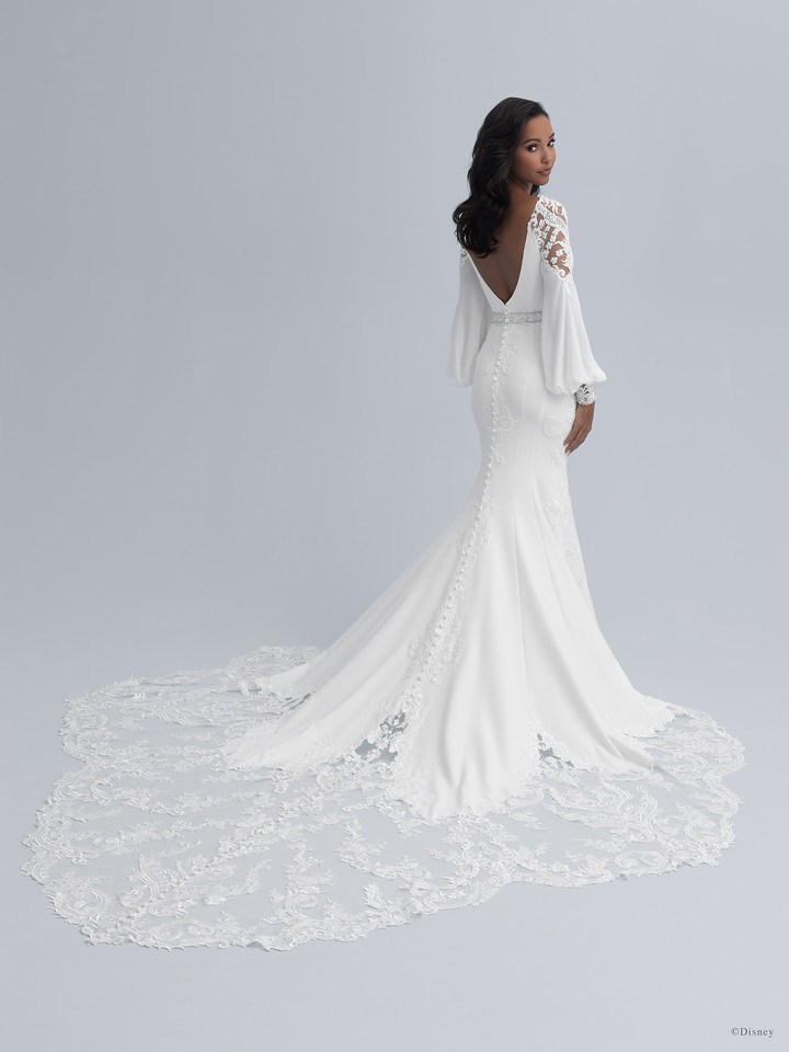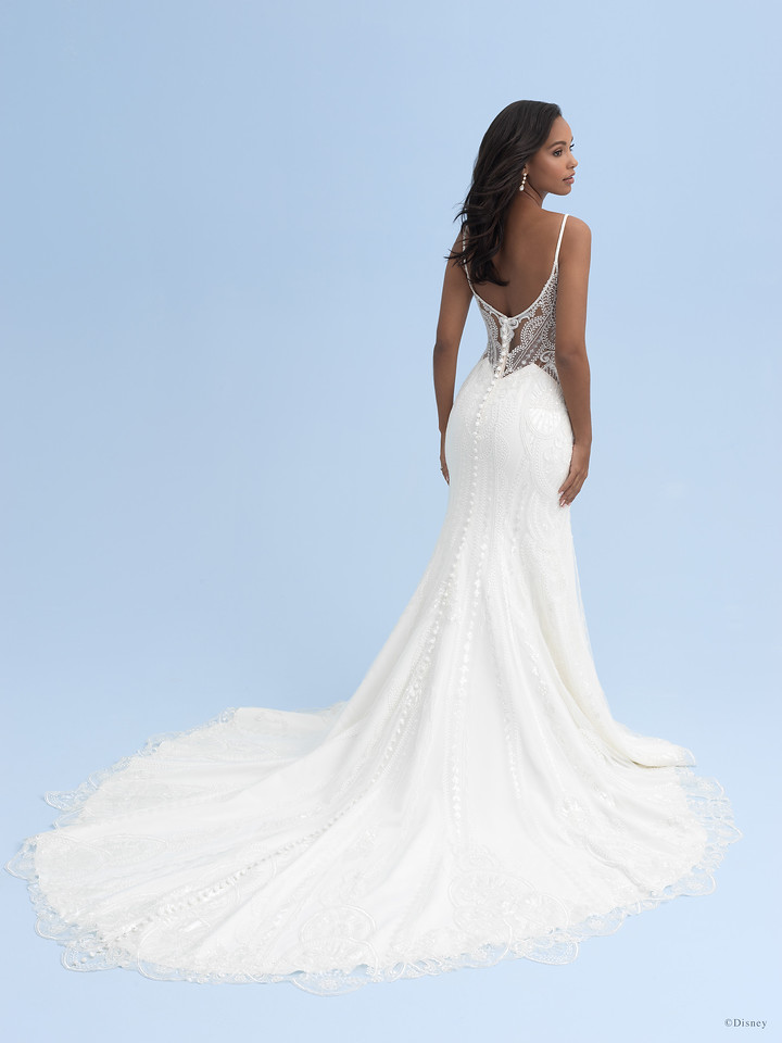 Taking inspiration from Princess Jasmine’s confidence and sense of style, this gown features beaded cuffed sleeves with sheer illusion paneling and sequin lace appliqués across the illusion train of the stunning Jasmine Platinum gown.