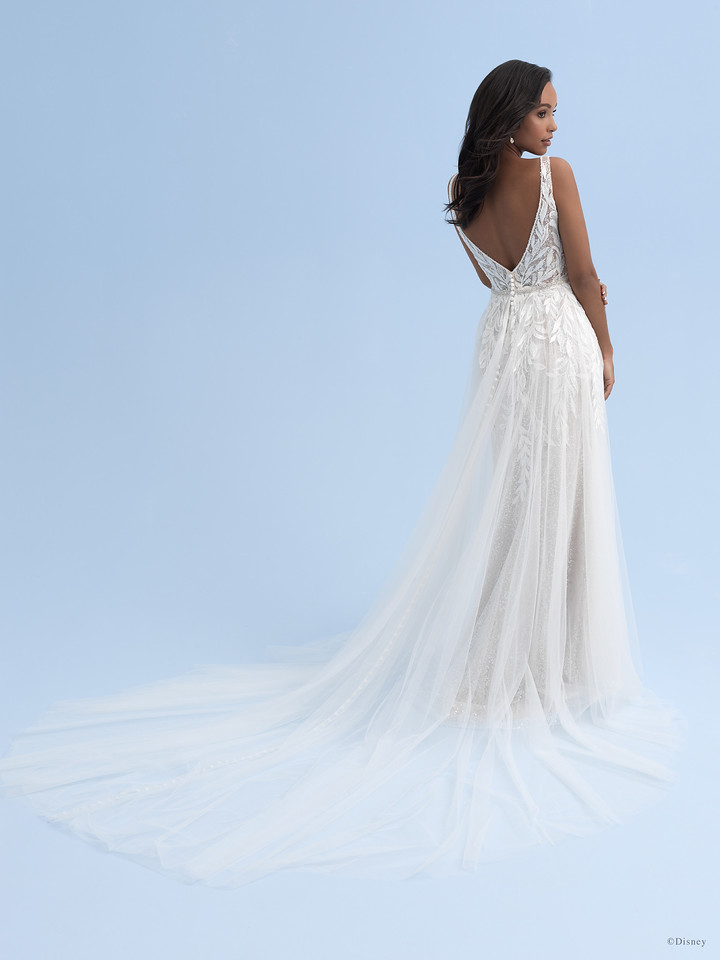 The Tiana-inspired Platinum ballgown takes inspiration from the magnolia blossom found in Tiana’s home town, New Orleans. Blossoms and leaflike appliqués wend their way across the illusion sleeves, bodice and train.