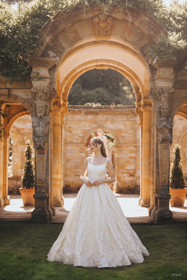 The Belle-inspired gown features a timeless ballgown silhouette, corset closure bodice and scoop neckline, covered in a stunningly rich floral brocade. A gown truly fit for a princess.