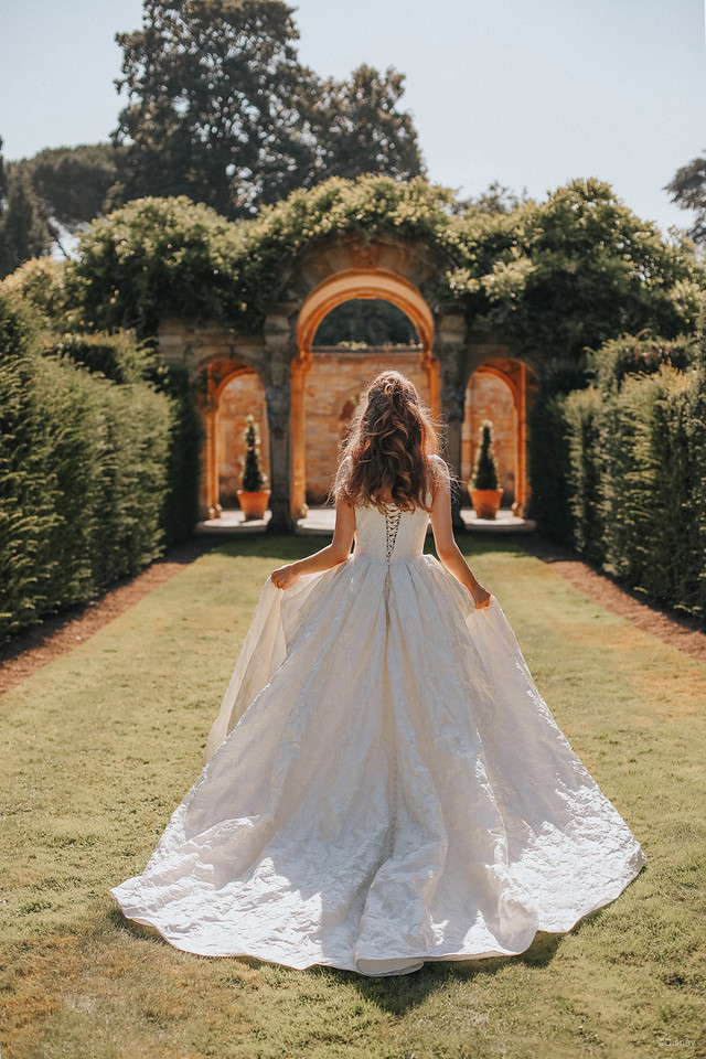 This classic satin finish ballgown, lined with sparkling Swiss dot tulle, features intricately beaded floral appliqués as a nod to Belle’s iconic motif: the rose.