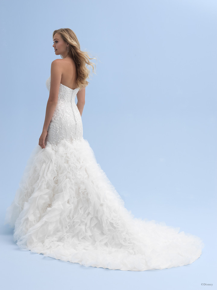 This A-line gown features stunning organza ruffles inspired by ocean waves and Ariel’s sense of adventure. The off-the-shoulder sweetheart bodice, covered in pearl beading, crystals, and sequins, is simply stunning.