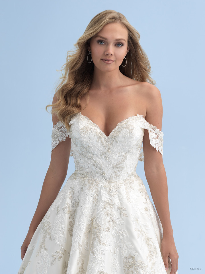 A pearlescent satin finish draws the eye to the timeless beauty of the Cinderella-inspired Platinum ballgown, which features texturized gorgeous embroidered clusters of textured blossoms, along with off-shoulder cap sleeves.