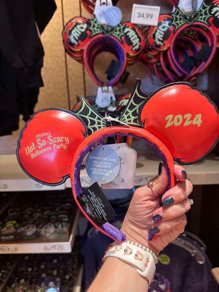 Complete your look this Halloween season with the 2024 Mickey’s Not-So-Scary Halloween Party mouse ears. The front design features an embroidered Trick or Treat design, while the back design features a printed party logo and date. These ears glow in the dark for illuminated fun! The ears are $34.99.