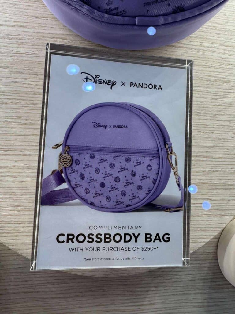 With your purchase of $250 or more, you’ll also receive this complimentary crossbody bag. The beautiful purple color is accented with Disney Princess icons and the Disney x Pandora logo. You can wear this bag with pride knowing you earned it! If you go through Shop Theme Parks to get the charms, you will receive the gift with purchase of 3 charms while supplies last.