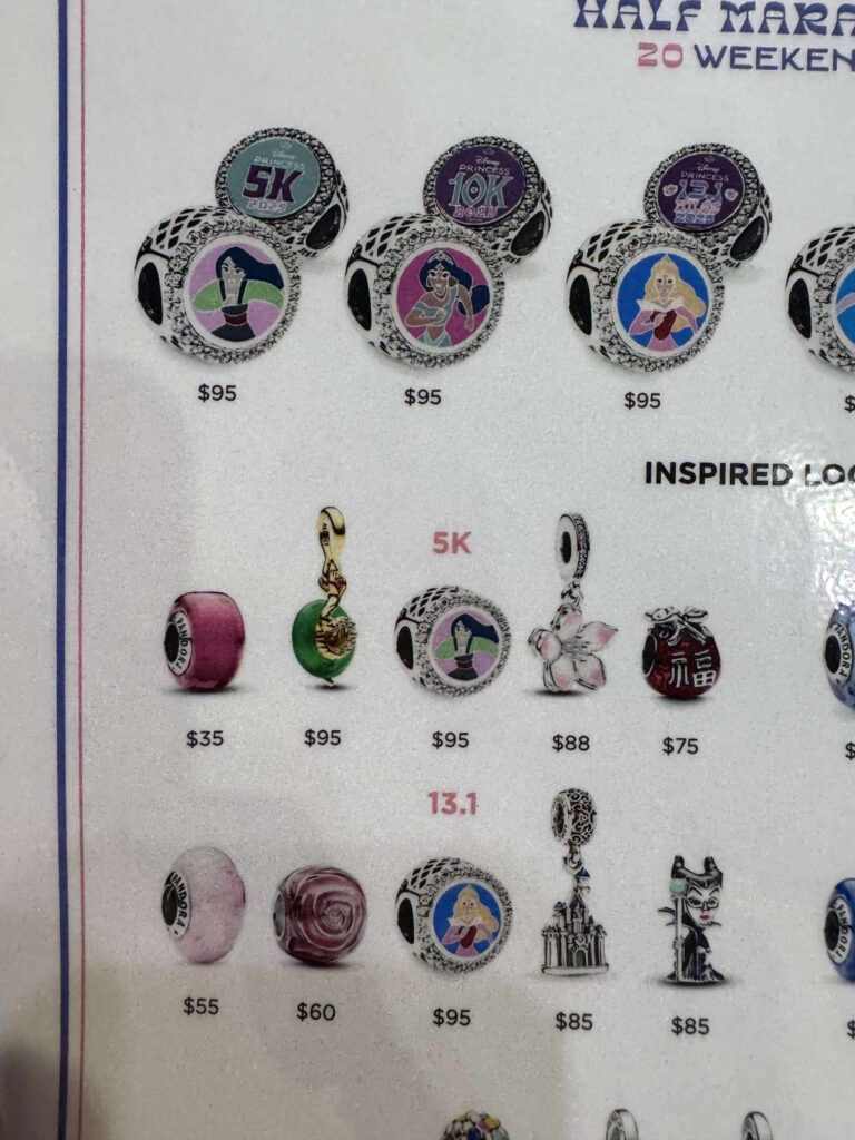 The charms shown above are $95 each. There are also some other Princess and Disney themed charms available for purchase as well. To note, there are 2 other new charms (not Park Exclusive) debuting at the Expo. The enchanted mirror and Dopey charm! They will be available at the Disney Parks beginning next week, but the race specific charms are exclusive to the expo.