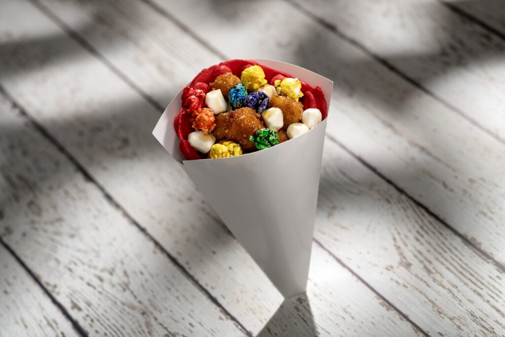 - Popcorn, Popcorn Chicken and Waffles with rainbow popcorn, popcorn chicken, mini mozzarella, and maple syrup (New)