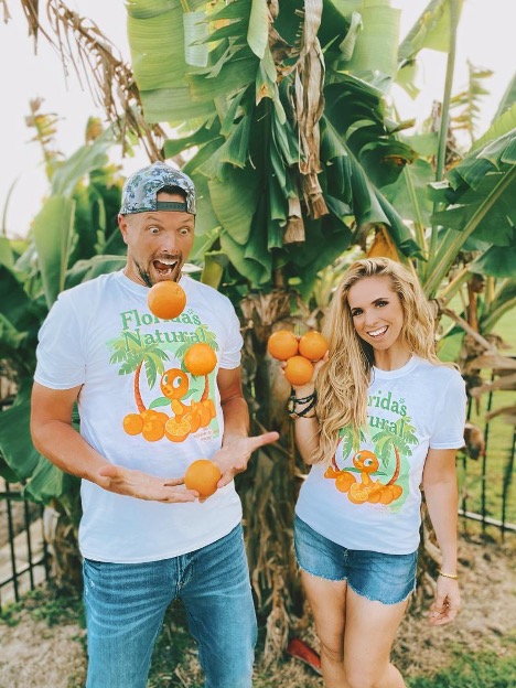 The sassy Orange Bird dances on oranges while palm trees sway in the background. He looks exactly how I feel when it’s July and I can finally put away my puffy winter coat and boots. The words “Florida’s Natural float above the trees, while the outline of Florida hides in the background. Look at this shirt closely because if you don’t you might miss a little detail at the bottom corner of the shirt. It says “100% Premium Florida Magic”, which makes me want the shirt 100% more.