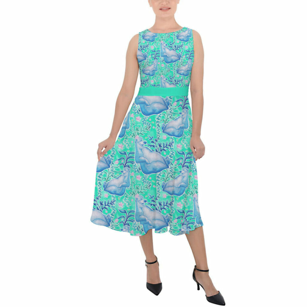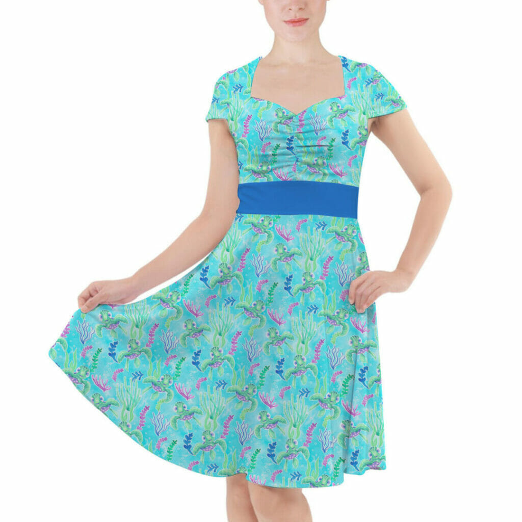 Head to dinner at the Coral Reef at The Seas with Nemo and Friends in a dress, leggings, or tee in the first print that features Squirt from Finding Nemo. He’s lazily swimming between colorful coral in this gorgeous ocean-themed print!