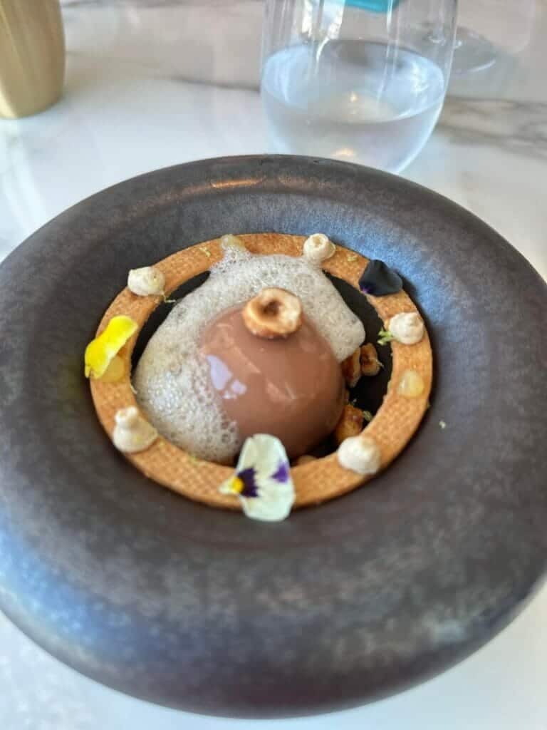 Our waiter described this dish as “a fancy Ferrero Rocher. He wasn’t wrong, but he did undersell it. This rich dessert packs plenty of flavor, is thought out meticulously, and is served beautifully.