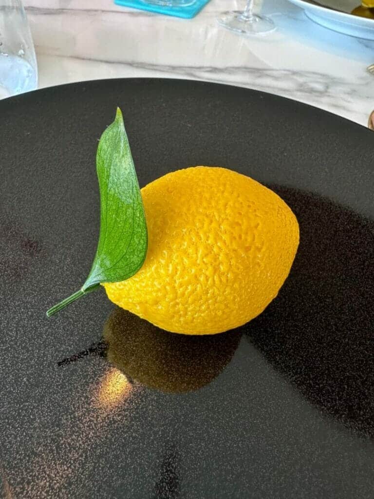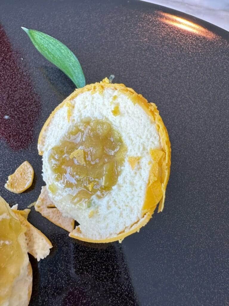 This dessert takes 3 days to create! The inside is filled with a perfectly tart (but not bitter) lemon jam that is made in-house. I could eat this jam with a spoon (and I literally did!). The next layer is a luxurious lemon cream that just melts in your mouth and makes you close your eyes in joy! Finally, the whole thing is coated in white chocolate, which perfectly cracks against your spoon. The talented team then hands the texture and final details to make this dessert truly spectacular.
