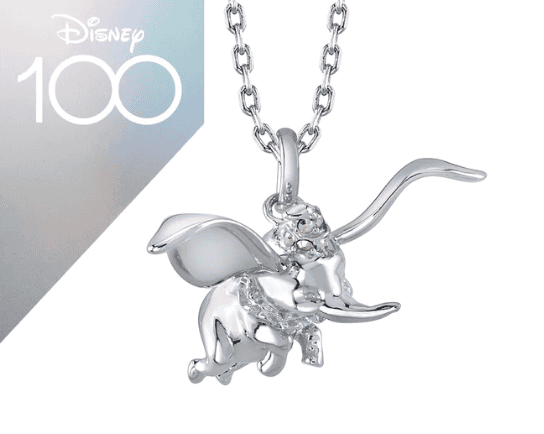 Just like Jiminy Cricket, Dumbo is ready to soar with you to new heights, from the safety of your neck, of course. His big ears are outstretched on both sides of him and he wears a jeweled hat.