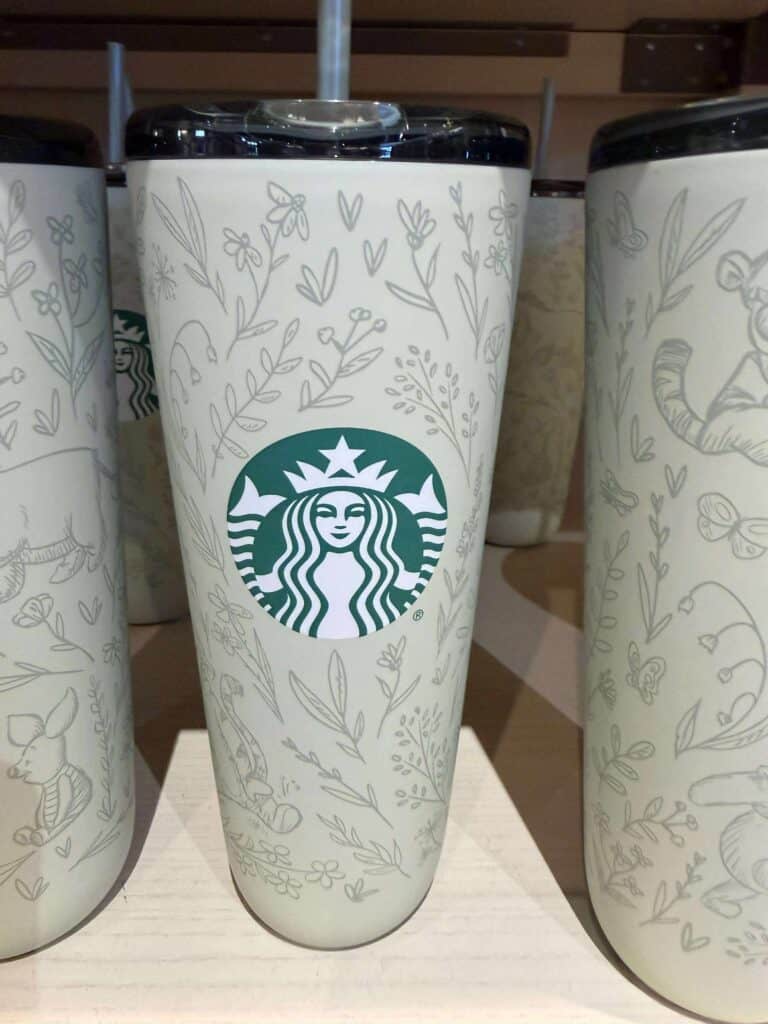 Floral elements weave throughout the design. to create a gentle nod to the Hundred Acre Wood. It gives an overall look that feels calm and comforting. You’ll find the green Starbucks logo stands out just enough that it anchors the design without overpowering it.