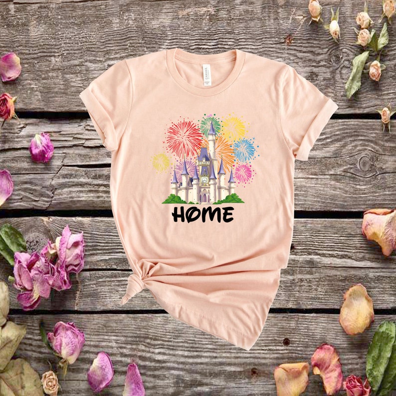 First, this shirt is perfect for all of us who have been missing our home away from home. The pretty peach pastel color is perfect for spring! Plus, there are added bursts of color with the bright fireworks over the castle. Whether you are headed to the Disney Parks or are just missing Disney, this is a fun shirt option for springtime. You can find it on Etsy from FrommayByJang HERE. Pricing starts at $12.99.
