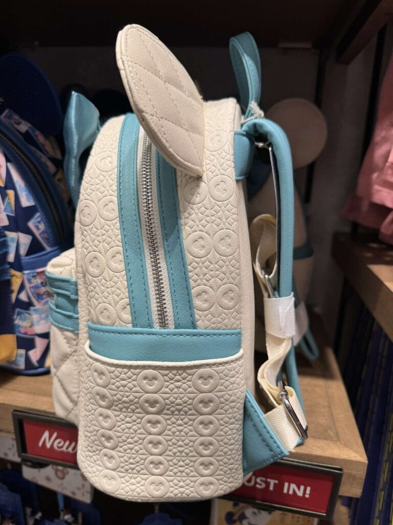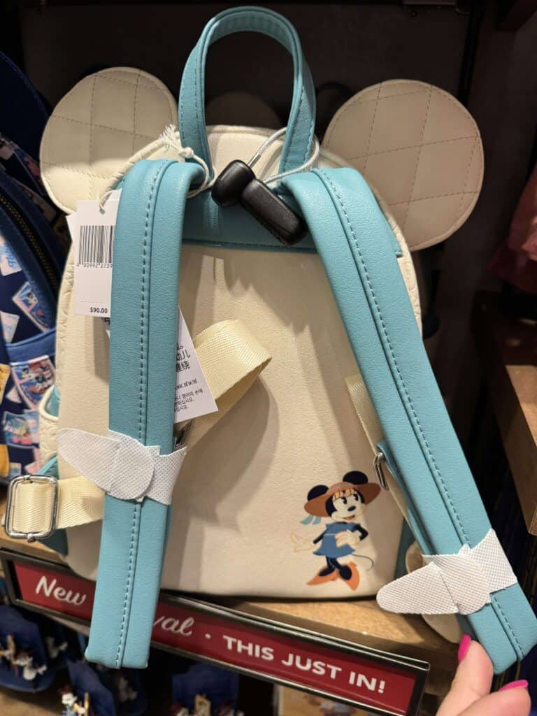 On the back, Minnie is posing in her high-fashion look that we know we all want to rock on the Riviera! The beautiful cream and blue are so elegant and really elevate the look of this mini backpack.