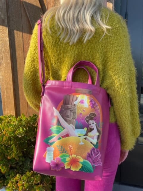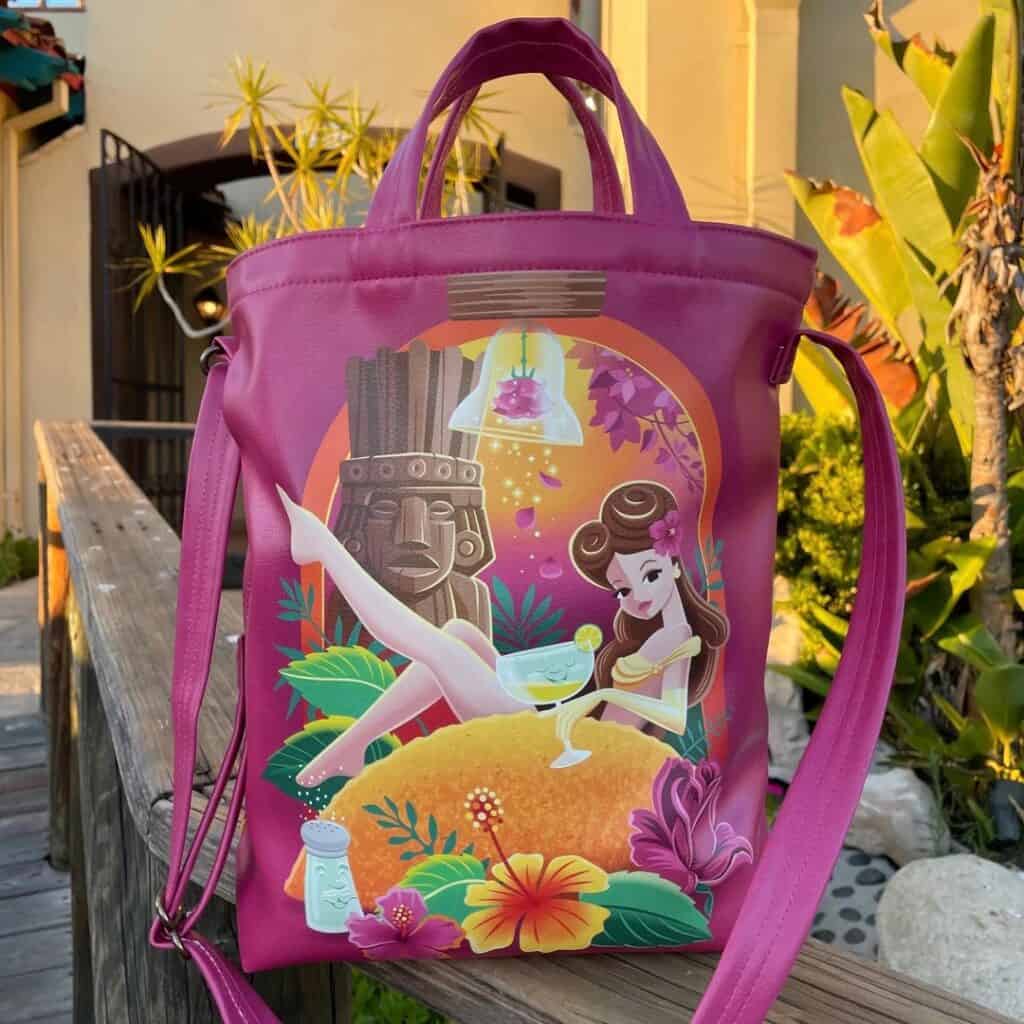 Check out this eye-catching Jeff Granito Beauty and the Beast (of a taco) bag! This is a fun fiesta of a carry-all. The bright magenta crossbody features a bikini clad Belle letting loose in a tropical setting. Hibiscus flowers, a saltshaker, and totem pole are splashed across the front of the bag as Belle kicks back from the taco she is nestled inside.