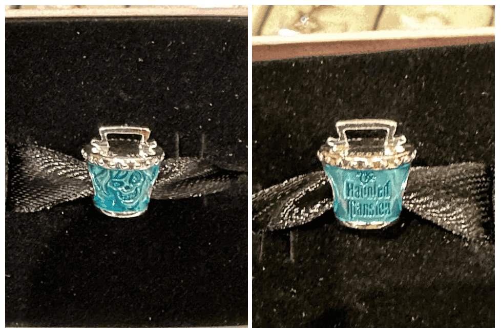 This precious charm features the Hatbox Ghost’s oh-so-scary face inside his hatbox! I love how the blue enamel makes the face appear to be glowing! I also love how detailed his face is so that you can see that iconic grimacing grin! On the back, you can see the iconic Haunted Mansion logo with the same blue enamel “glow” making the words really pop! The tiny handle and other details on the hatbox make this charm absolutely precious!