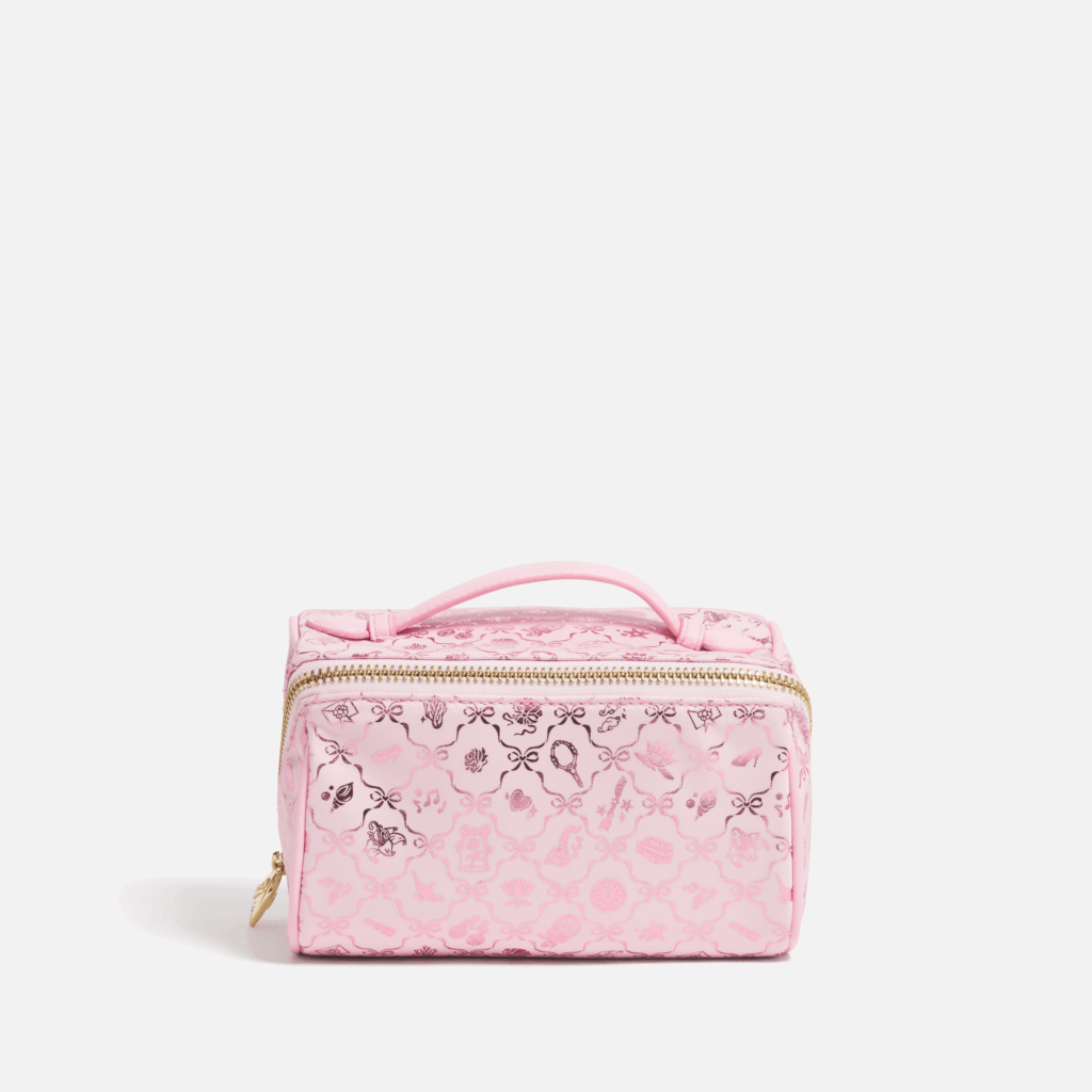 - Multiple pouches and cosmetic bags in soft pink with white castle outlines