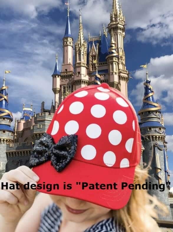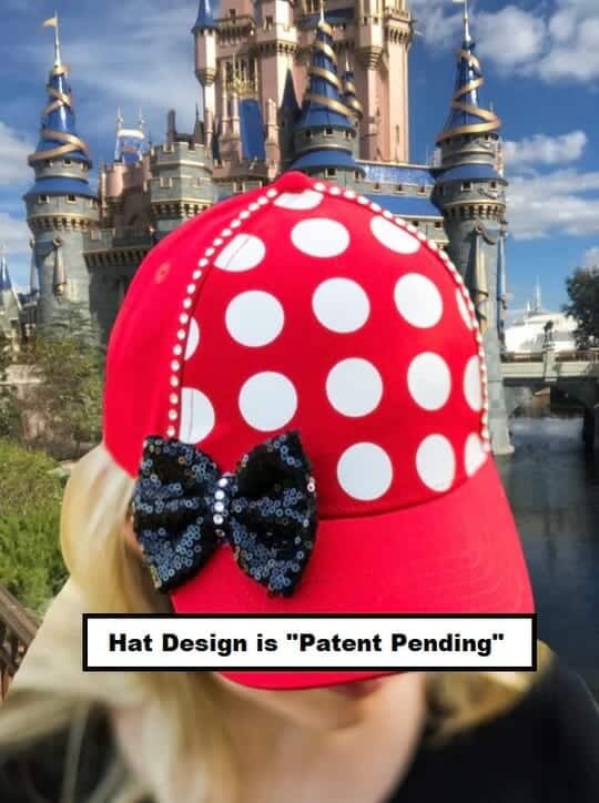 Royalty by Design offers a Fashionista solution to the issues listed above. An adorable Minnie Mouse red and white polka dot hat. If designed after Minnie wasn’t cute enough, a sequin bow adds a special touch. For the Fashionista who likes a little extra glitz, choose the hat rimmed with rhinestones. Two lines of sparkling gems separate the polka dots from the red hat. Furthermore, a row of rhinestones is added to the middle of the sequined bow.