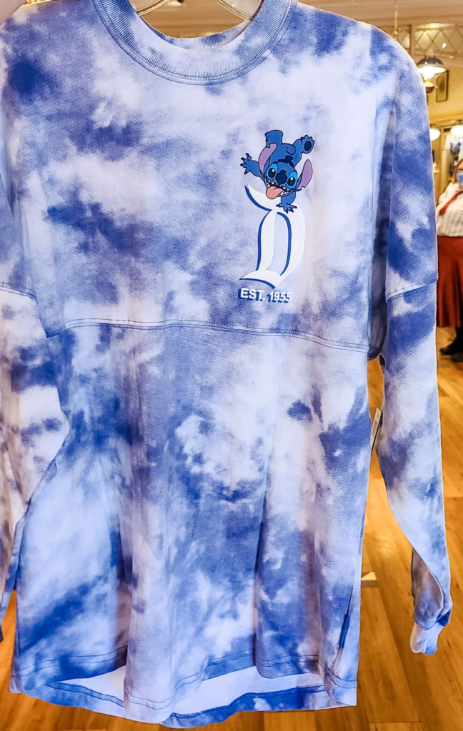 This precious blue tie-dye Spirit Jersey features the Disneyland “D” and “EST. 1955” on the front along with “Disneyland Resort” across the back shoulder. What I love about this Spirit Jersey is that you can spot Stitch above the “D” standing on one hand with his tongue out! On the back, he is chewing on the “e” in Disneyland and clawing at the back! There is also some alien writing just below the resort logo on the back along with the words “Experiment 626!” It looks like Stitch even took a little bite out of the 2!