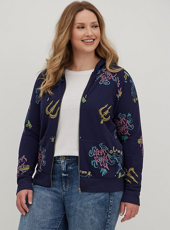 First up are these sweatshirts! There is a lace-up sweatshirt featuring Ursula, Maleficent, the Evil Queen, and Cruella de Vil along with the words “Bad For You.” There is also this zip hoodie featuring tridents, the words “A lovely mess” surrounded by tentacles, Ursula’s face with the words “So long lover boy” and the words “Always fierce” with Flotsam and Jetsam.