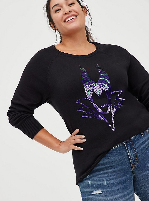This hi-lo hoodie features the Evil Queen along with the words “When I’m offered decaf” for a meme-style top, and this embellished sweater features fabulous sequins in the shape of Maleficent’s face.