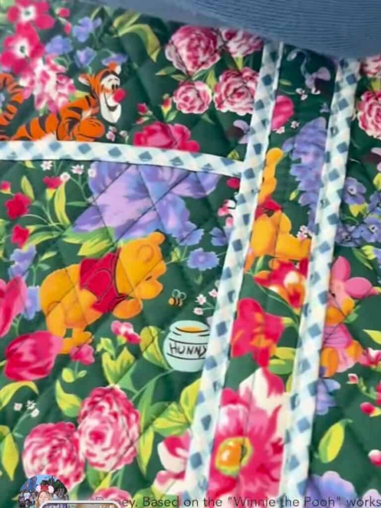 The first pattern features Pooh Bear surrounded by lush florals in soft pinks, blues, and greens. It feels romantic and timeless — very classic Vera Bradley — with Pooh tucked sweetly among the blossoms. If you love florals with a subtle character touch, this one will likely be a favorite.