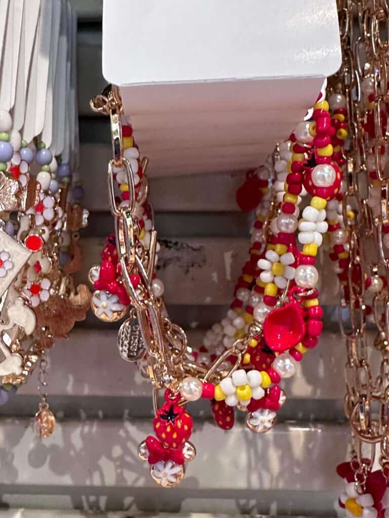 First, there is a Mickey and Minnie daisy collection. It includes earrings, necklaces, bracelets, and a ring that features Minnie heads, Mickey heads, bows, daisies, and even strawberries! While the collection is predominantly red and yellow, there is a lovely turquoise and coral pair of earrings. All the pieces would make a great addition to any park outfit!