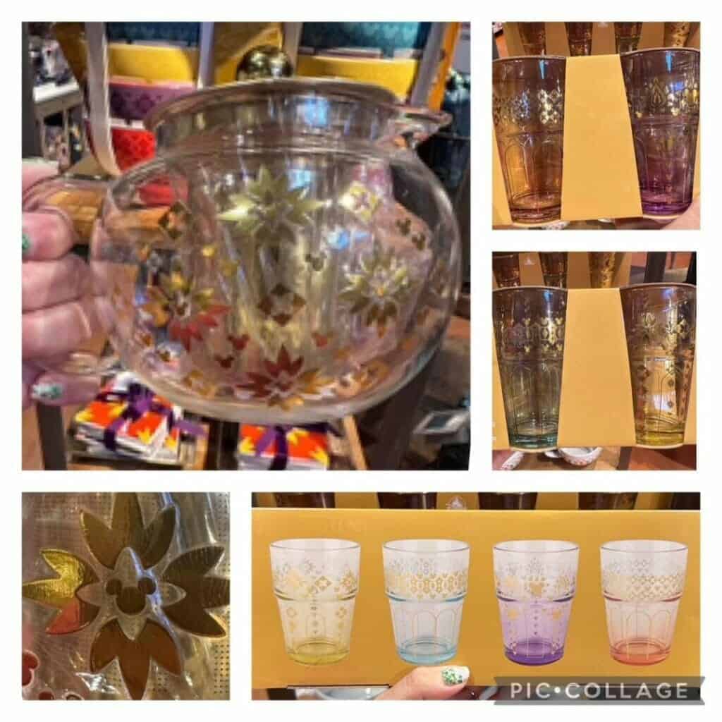 Lastly, share a glass of tea with the set of 4 drinking glasses and teapot. The opaque drinkware of lightly colored glass again replicates the artisian design of the above dishes. The set includes purple, yellow, blue and red with golden embellishments. If you enjoy steeping your own tea, turn to this quaint clear pot. Golden Mickey bursts along with quarterfoils enhance the ecletic pot. Inside you’ll find a mesh to hold tea leaves. You can’t get more authentic that that!