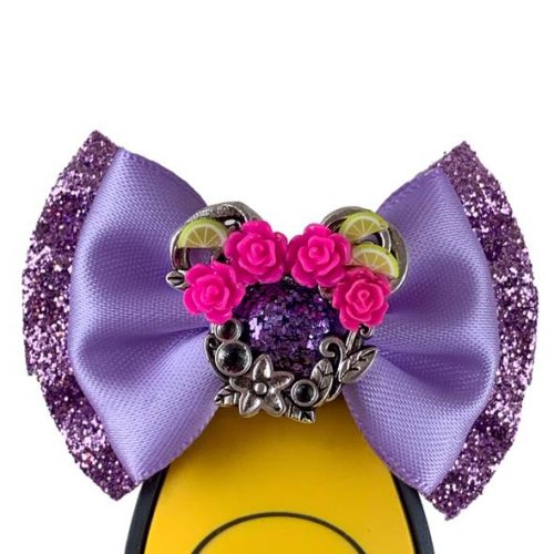 The first is a Violet Lemonade Ear-Inspired Bow that features purple glitter, a pink flower crown, and tiny lemon slices on the ears of the Minnie Mouse icon–just like the Violet Lemonade Ears you can find at the festival!