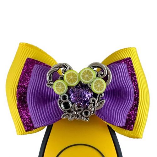 The fourth is a Violet Lemonade-Inspired Bow that features a purple and yellow bow with purple and yellow glitter along with a purple and yellow flower. The flower even has a Mickey Mouse icon as the center!