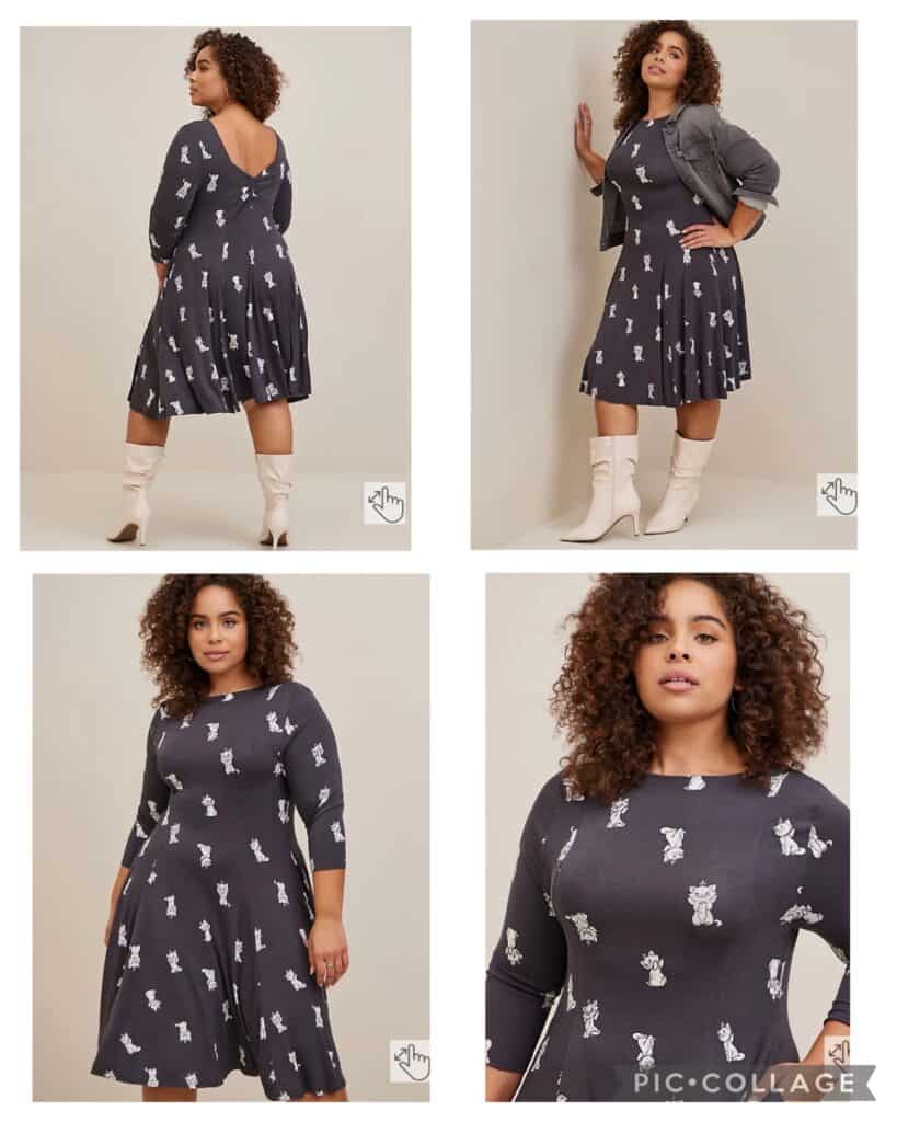 Why should you buy this dress? In the words of Marie, “Because you’re a lady, that’s why!” Who doesn’t need a super soft skater dress in their wardrobe? Especially one with an adorable kitten on it! Sweet Marie poses in various states of sweetness on this blue-grey knit dress. The back of the dress features a v-neckline with rouching in the middle.