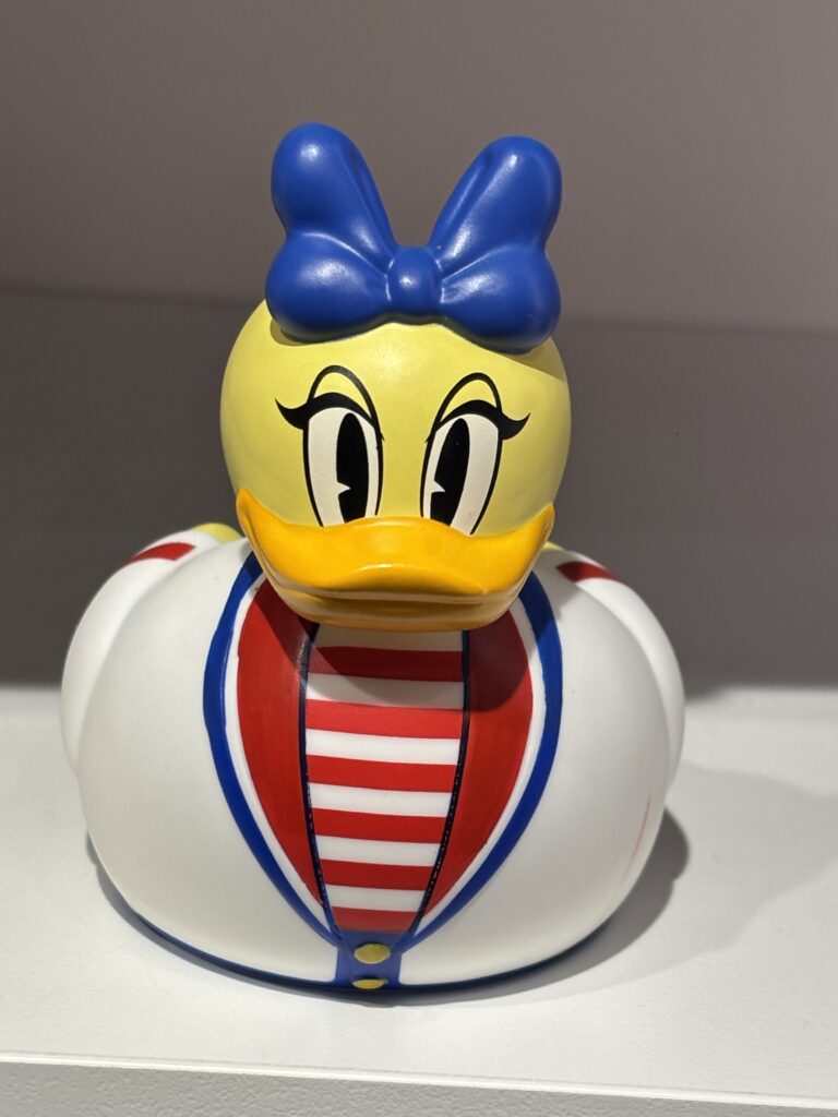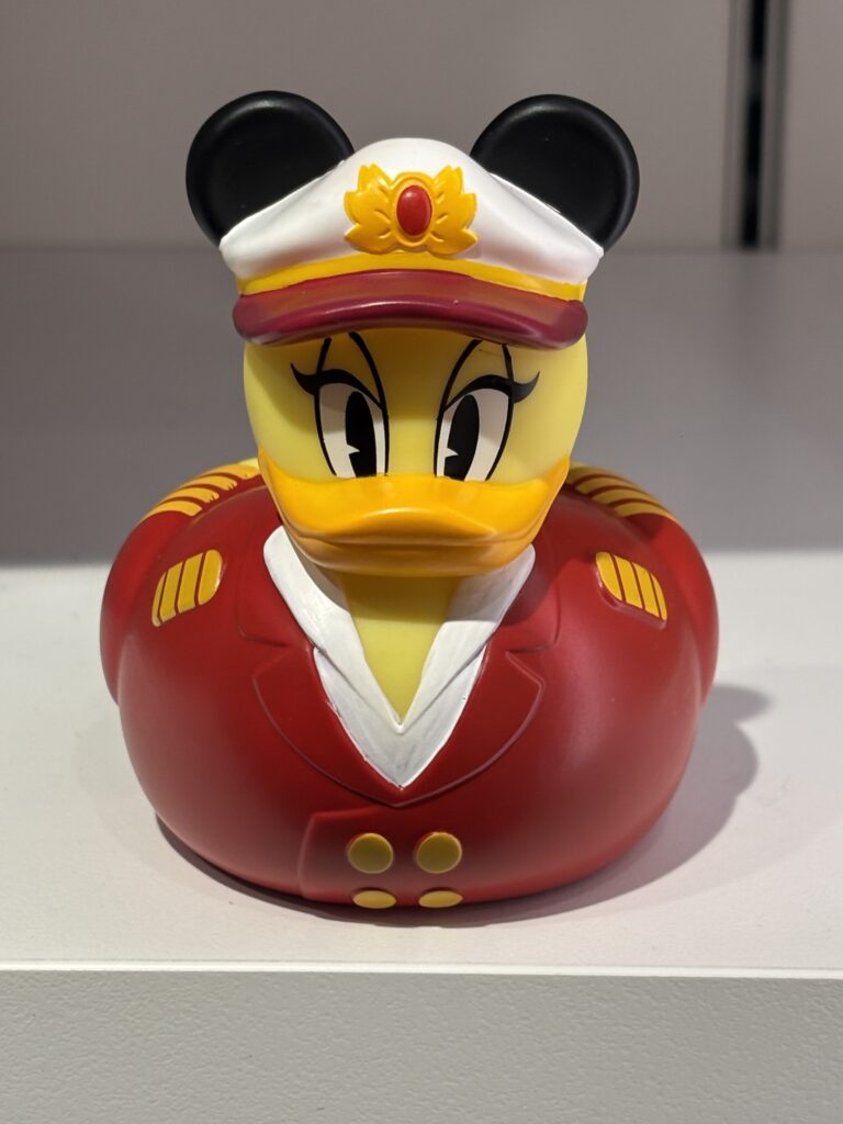 Meet Captain Donald and Captain Daisy. The ducks are the full-size rubber duckies you might see on Jeeps that have been ducks standing approximately 3-4 “ tall and 3” long. Donald proudly wears the blue captain’s jacket that his buddy Mickey wears, while Daisy dons the red blazer of her fashionista friend Minnie.