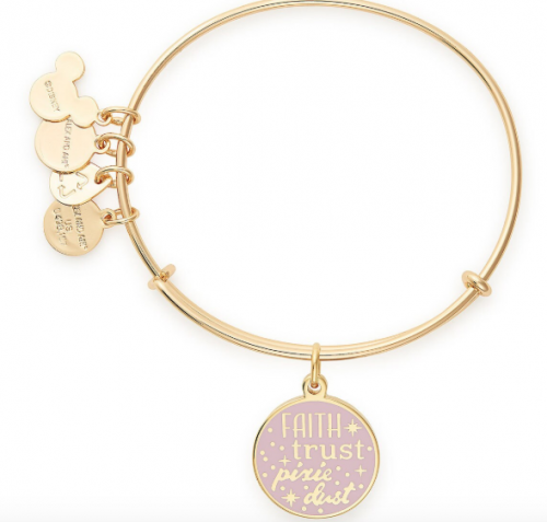 The opposite side has the quote Tinker Bell is known for, Faith, Trust, and Pixie Dust. Pixie dust can be found on the opposite sign, too. I am loving the color combo of the pastel/pale pink with the gold metal. This new double-sided bangle doesn’t come in more than one metallic finish. It comes in gold.