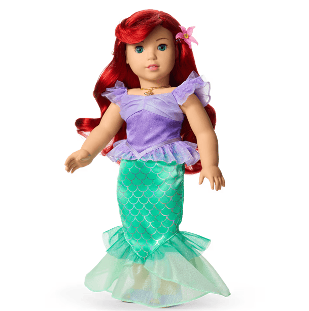 Princess Ariel Doll has aqua-colored eyes and red wavy hair with sideswept bangs and comes dressed in a classic mermaid-style dress.