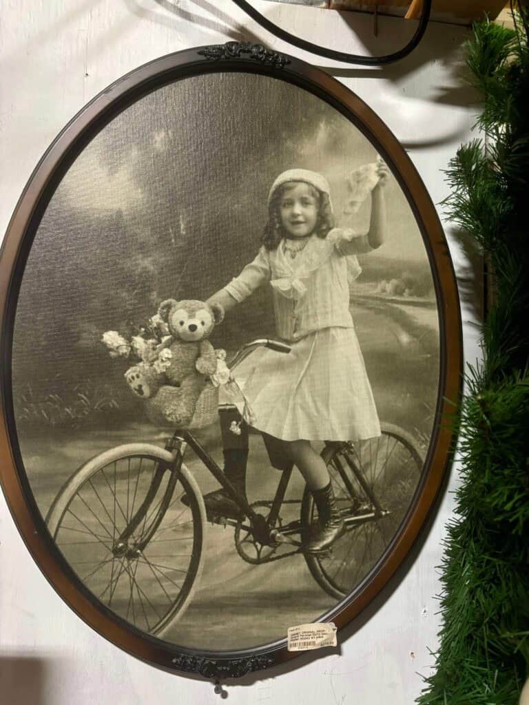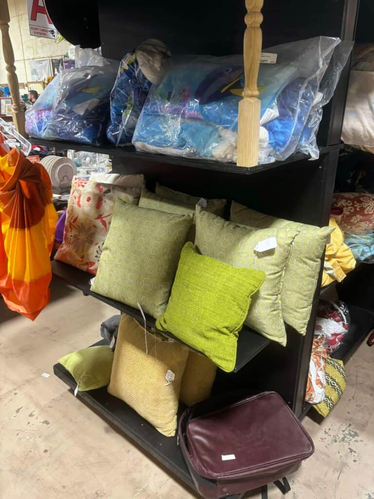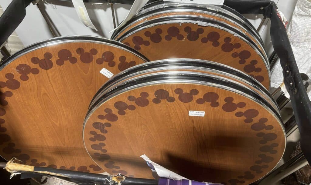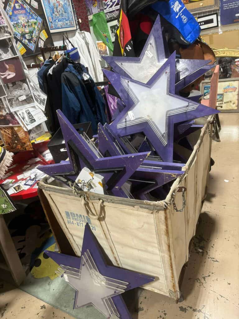 Ever wonder what Disney does with their furniture and decorations when they remodel? We discovered a sweet sepia wall print featuring Duffy that once hung at the Grand Floridian. Other bounty included star props from Pop Century and mirrors from the Animal Kingdom resort. There are even Christmas decorations used from past years available to purchase! Shelving containing cast-off pillows and bins of linens line the back of the store. I’m kicking myself for not purchasing a beige curtain with embroidered Mickey Mouse.