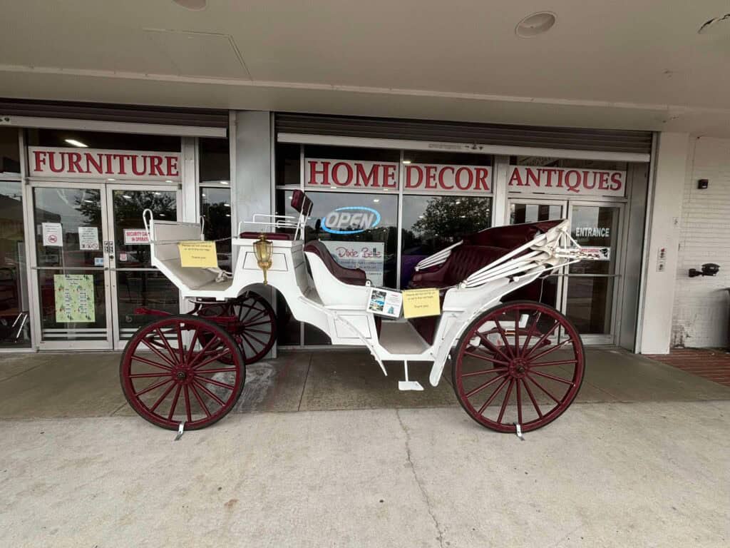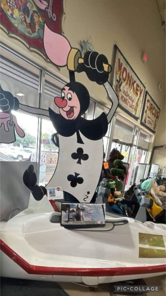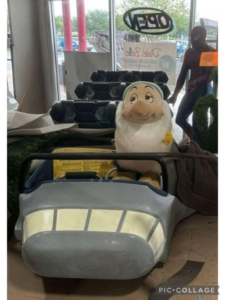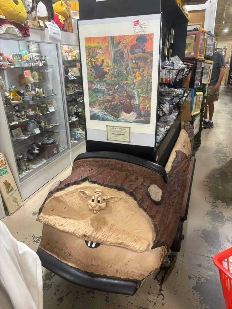 Located at 3530 US Hwy 98 North, the Lakeland Antique Mall is a must visit location for the die-hard Disney fans, like my sister and I! Walking down the rows of the store was a literal walk down memory lane, especially for these Orlando born girls. The Antique Malls hosts stalls for various consigners of both new merchandise, collectibles, individual artistry, and resort discards. Above you’ll see a buggy used at Port Orleans for horse drawn carriage rides, along with “cars” used in theme park rides. Notice the Splash Mountain log used in the vendor’s display.