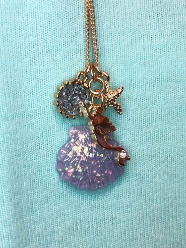 The necklace is a gorgeous charm pendant that has a silhouette of Ariel, and sea icons dangling over an iridescent purple shell. The purple shell has totally become an icon that makes us think “Ariel” right away, so it’s the perfect backdrop to the gold-toned Ariel charm.