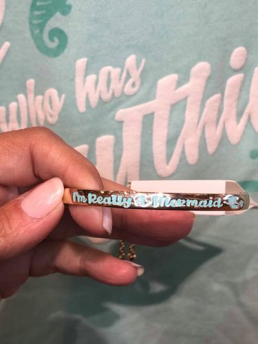 Finally, the ensemble is topped off by an engraved skinny cuff bracelet. The engraving says “I’m Really a Mermaid” and is filled with an aqua colored enamel for a pop of contrast.