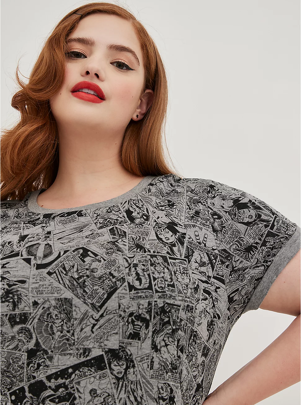 The world of Marvel wasn’t always film franchises and series on Disney+. It started out as comic books! This Roll Sleeve Top pays tribute to Marvel’s beginnings in a fun, graphic way.