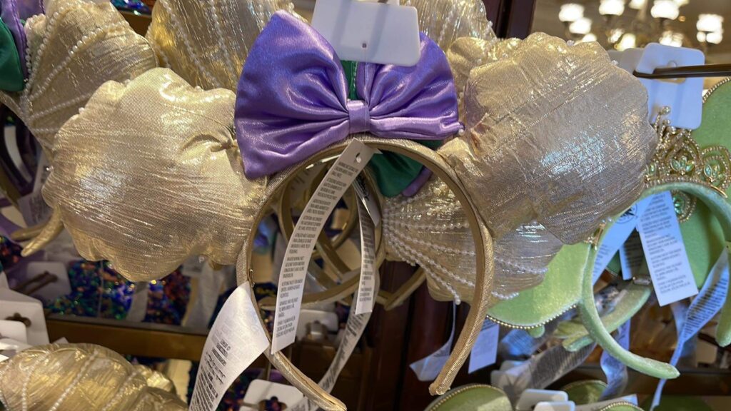 These new Little Mermaid ears are different than others we have seen in the past. The ears themselves are still shells but, to me, they are an elevated look. Shining, oyster shells are what they appear to be, and, based on the pearl in the center of the bow, I’d have to say I’m on to something. The lines on the shells are also mini pearls which really make these ears look expensive.