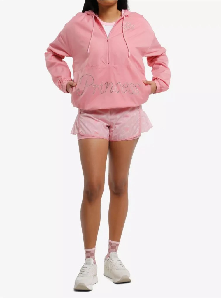 The coordinating athletic shorts are a wardrobe essential. They feature a soft pink hue with a gentle pattern. Lightweight fabric keeps them breathable and easy to move in. Pair them with tanks, tees, or the matching windbreaker, which pulls everything together. Rhinestone “Princess” lettering and crown accents elevate the design. It’s lightweight, functional, and undeniably cute. Ideal for layering on breezy mornings or cool evenings.