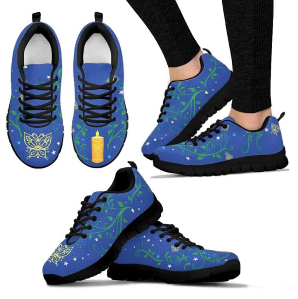 Whether you’re working out or not, everyone needs these stunning sneakers! The bright blue definitely makes a statement everywhere you go! Let the Magic of Forgiveness and Love lead the way with the magic candle and butterfly upon the toes of the shoes. Again, like the sports bra, the black outline against the bright blue really makes the color stand out!