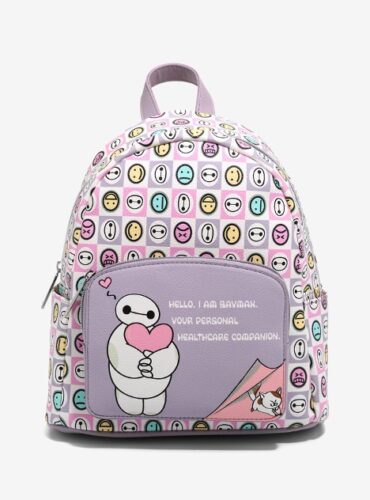 This backpack is done in pastel colors including pink, blue, and purple. The majority of the body of the bag has a checkered pattern featuring faces with different emotions. It also has a pastel purple back and matching adjustable straps. There is a small pocket on each side of the backpack and a larger zip-up pocket on the inside. The front of the backpack has Baymax squeezing a huge pink heart. There is also a cat on the front who appears to be running away. Maybe it is worried that Baymax is going to squeeze him with the same force that he is squeezing the heart with. The saying, “Hello. I am Baymax your personal healthcare companion” is also written on the front of the backpack. This one can be found HERE.